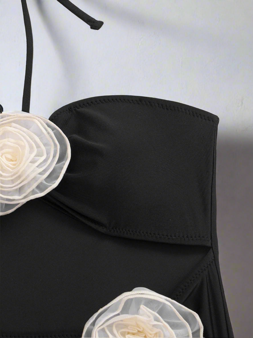 בגד ים בגזרת שלם סטרפלס עם צווארון קשירה, עם פרחים תפורים ופתח קאט אאוט. בגזרה צמודה ומחמיאה לגוף ובצבעים קלאסיים ואלגנטים שאף פעם לא נמאסים.