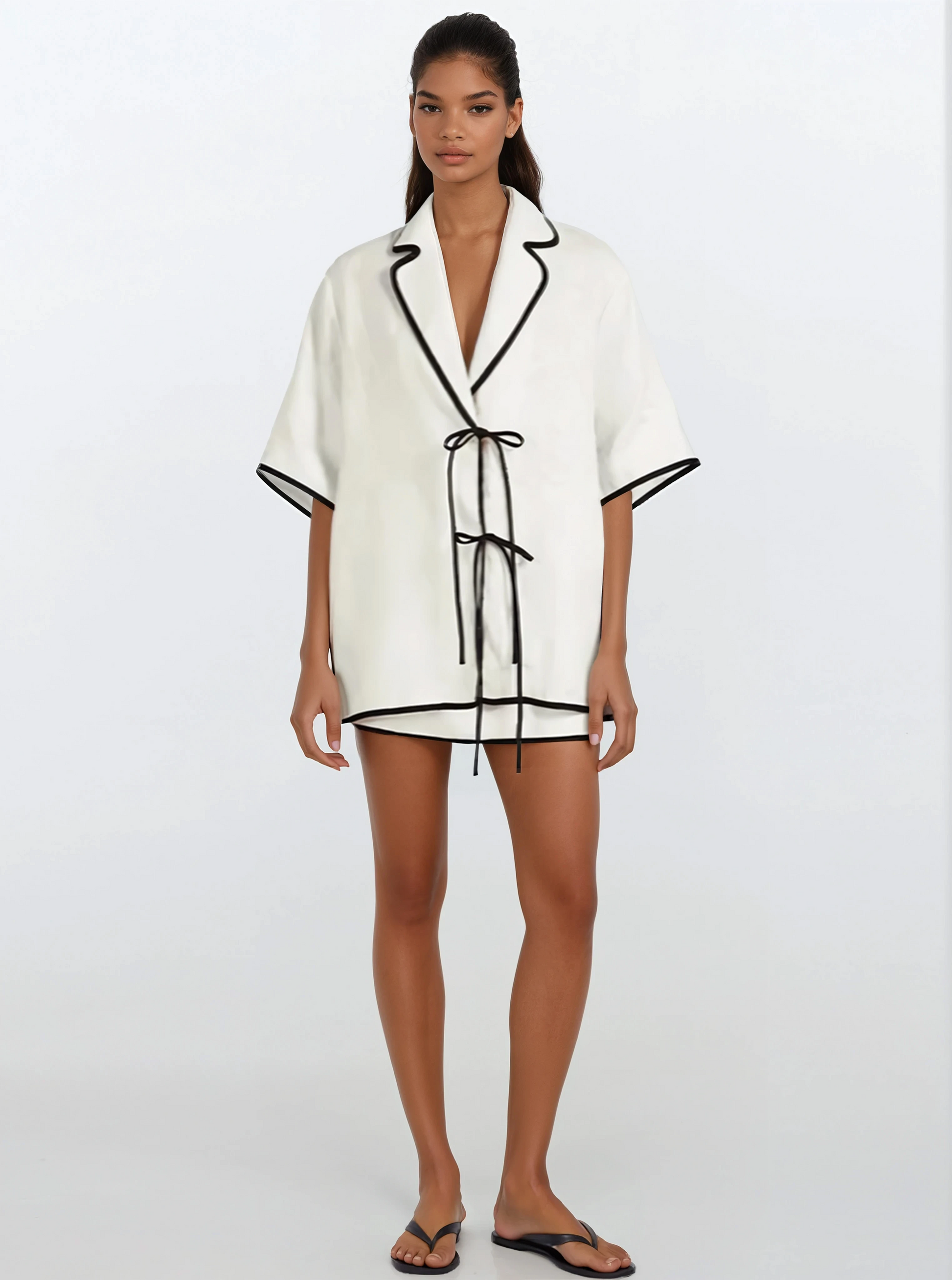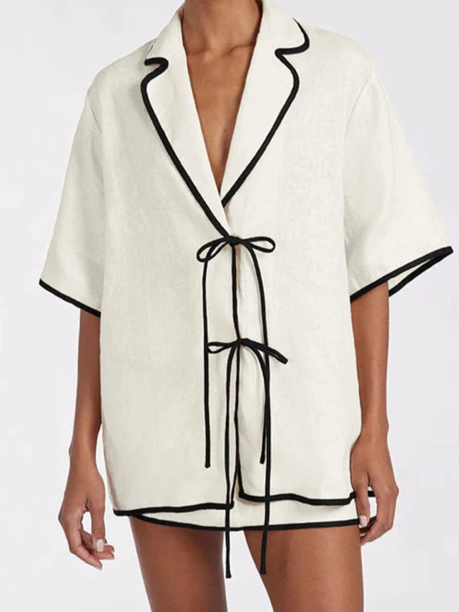 Ā ×—×œ×™×¤×” קצרה וקיצית עם חולצה ×ž×›×•×¤×Ŗ×Ø×Ŗ אוברהייז בשילוב פפיונים ×•×¦×•×•××Ø×•×Ÿ מחויט עם חצאית מיני, החליפה עשויה ×ž×Ŗ×Ø×›×•×‘×Ŗ פשתן בשילוב ×¤×•×œ×™××”×˜×Ø והיבי הפנדקה. חליפה איכותית ויוקרתית שמקפיצה לך את הלוקים לימי הקיׄ והאביב.Ā