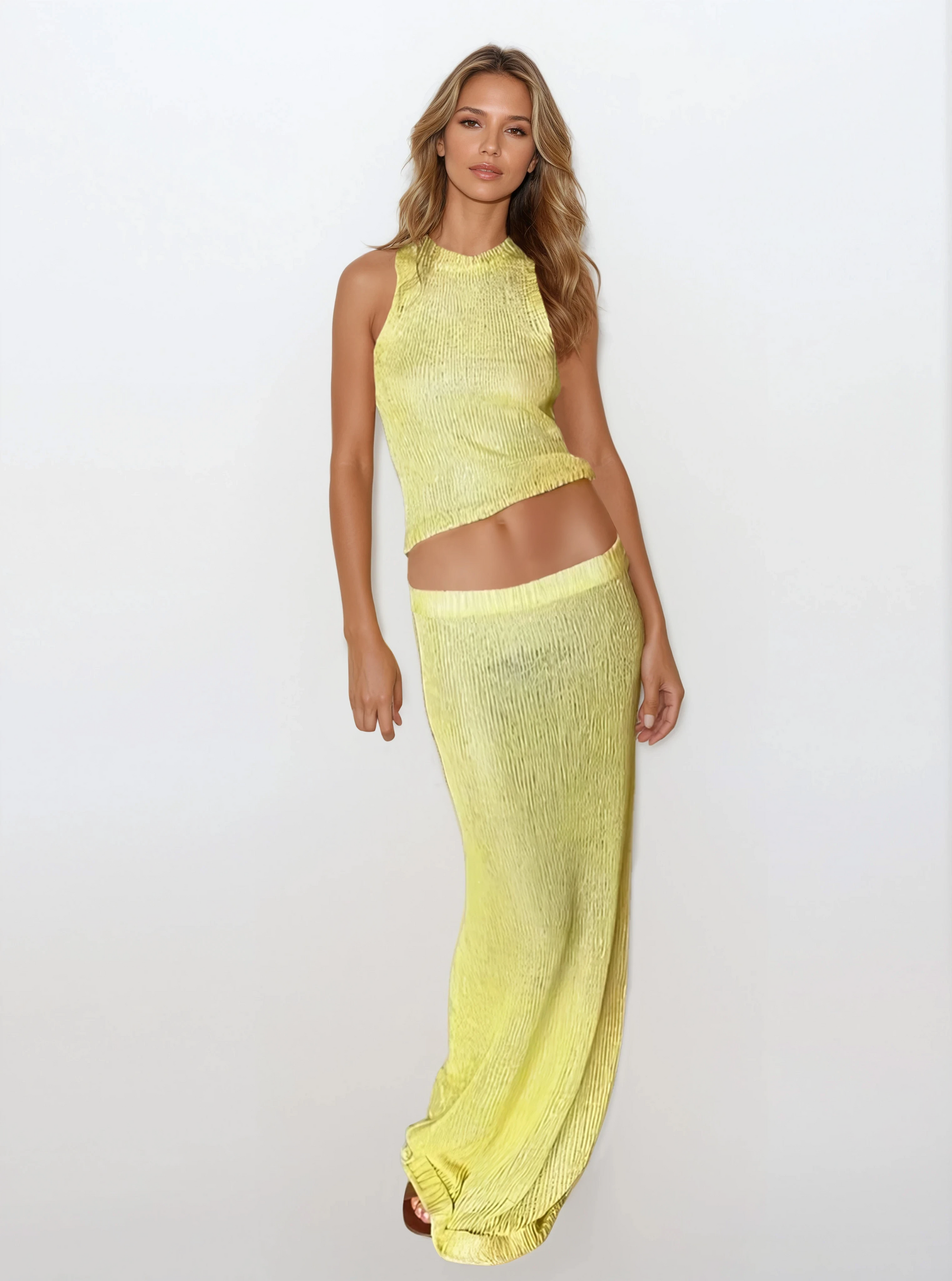 סט עשוי מבד סרוג איכותי בשילוב כותנה, עם גופיה בגזרה קלאסית המשתלבת עם הכל וחצאית מקסי ארוכה, צמודה ואוספת להשלמת הלוק, הסט שיתאים להכל ויקפיץ כל לוק.