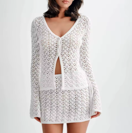 חליפת סריג מושלמת וקיצי, עם חצאית מיני וחולצת קרושה מבד סרוג, דק ונעים- החליפה המושלמת לימי הקיץ!