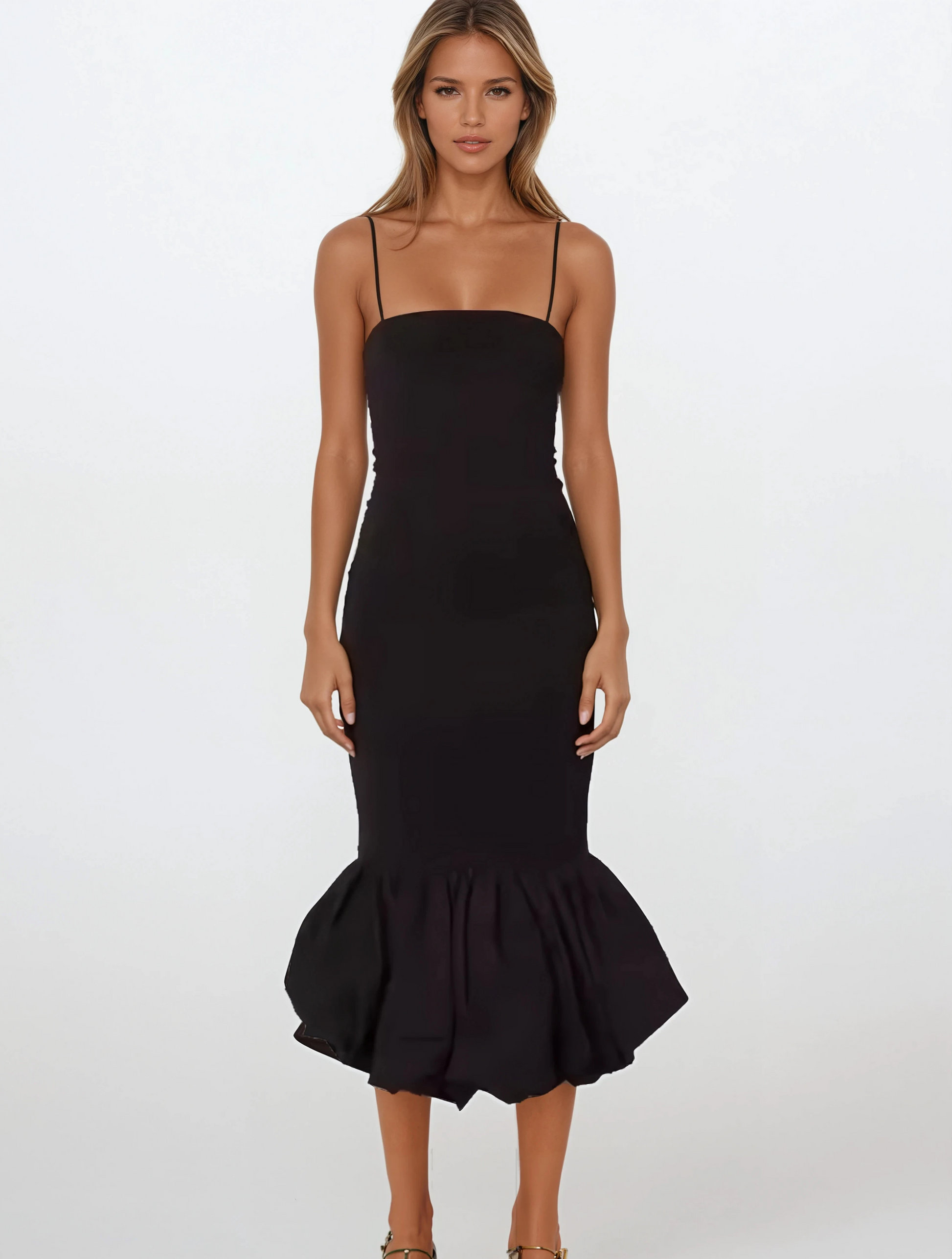 שמלת מידי בגזרה צמודה עם סיומת בסגנון מלמלה באפקט בלון, עם כתפיות דקות ליצירת המראה הקלאסי והאלגנטי, שמלה שמשדרת יוקרה ואלגנטיות שמתאימה לכל אירוע. הרכב הבד: פוליאסטר בשילוב כותנה.