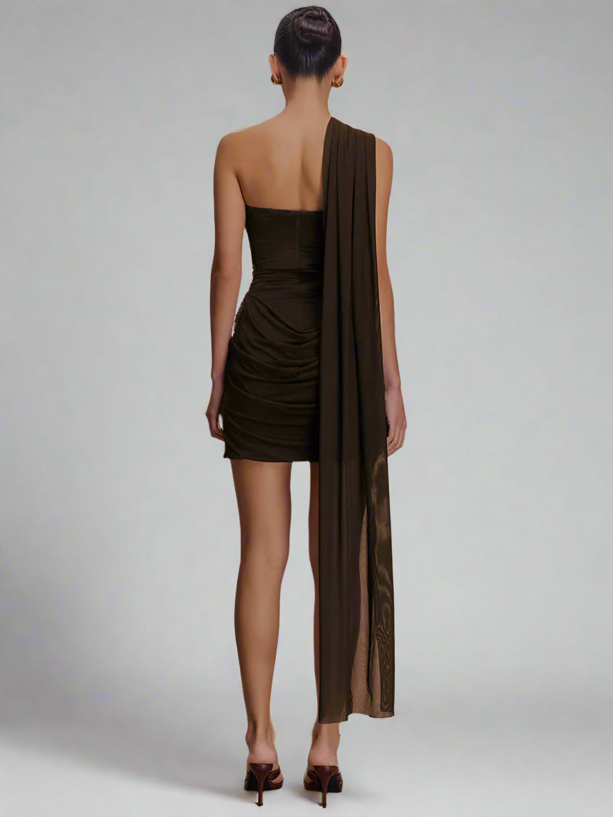 שמלת מיני בגזרת מחוך צמוד בשילוב חצאית כפלים מיני, בשילוב צעיף בד בגזרת וואן שולדר, עשוי מפוליאסטר בשילוב כותנה.