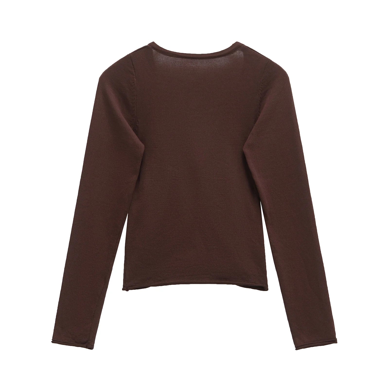 חולצה ארוכה בגזרה קלאסית בשילוב שרוולים ארוכים עם צווארון פתוח בגזרת פתח וי ובשילוב צ'ארם חום קדמי עם כיווצים.