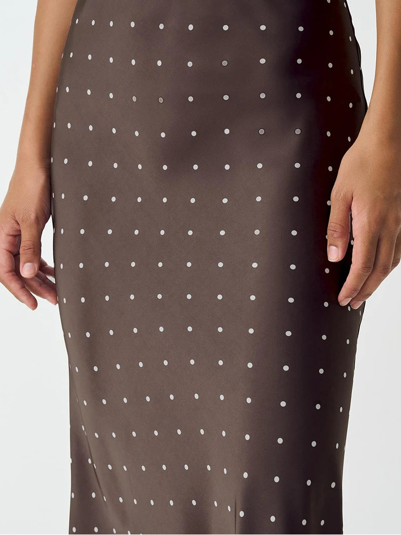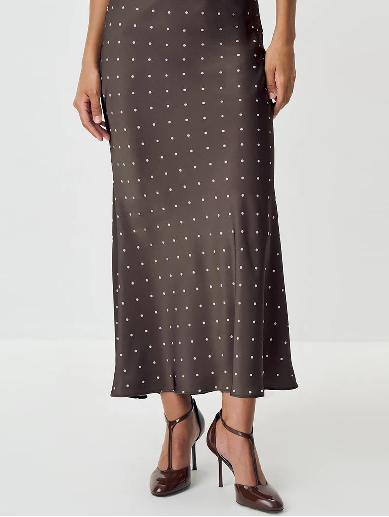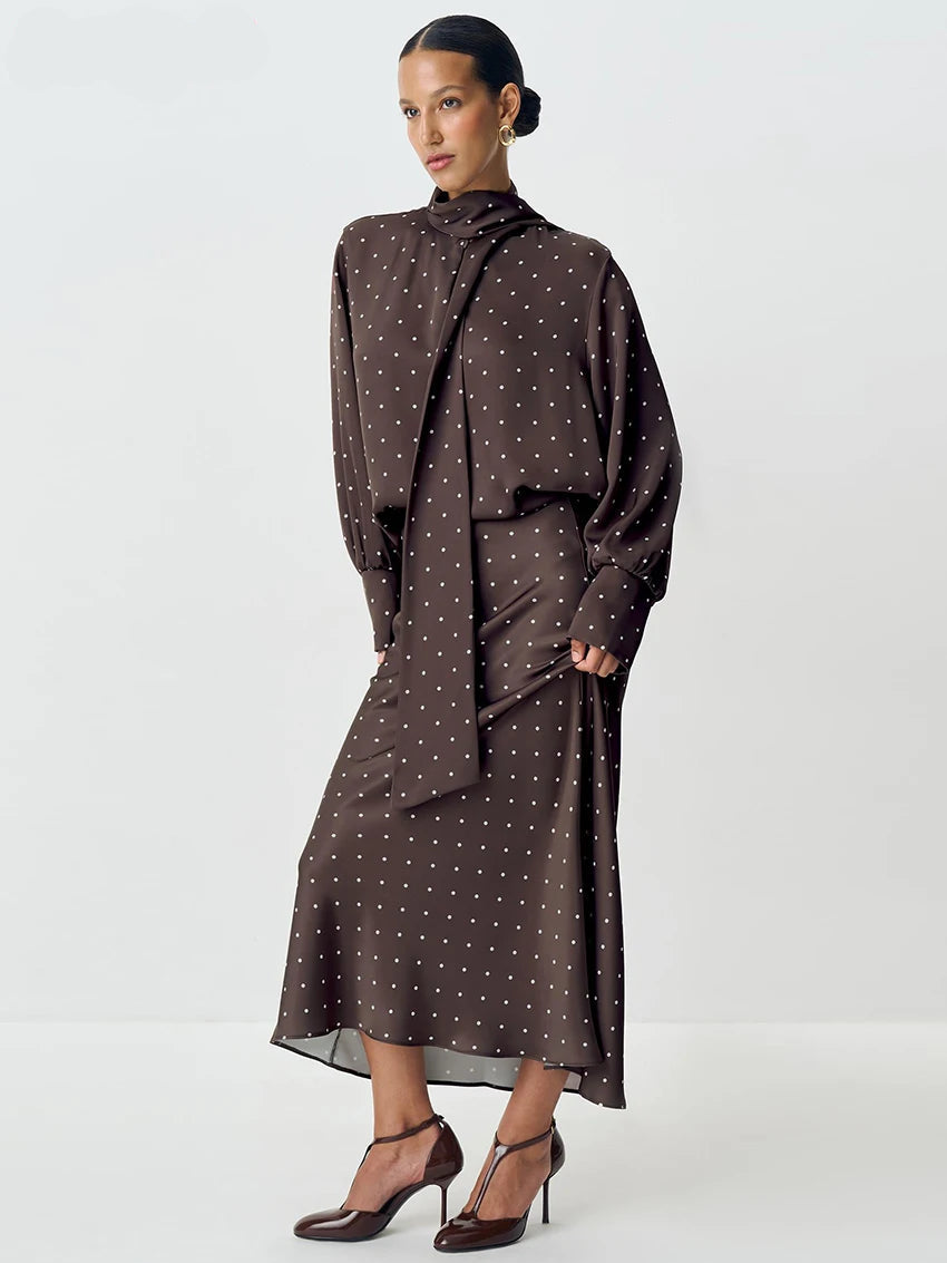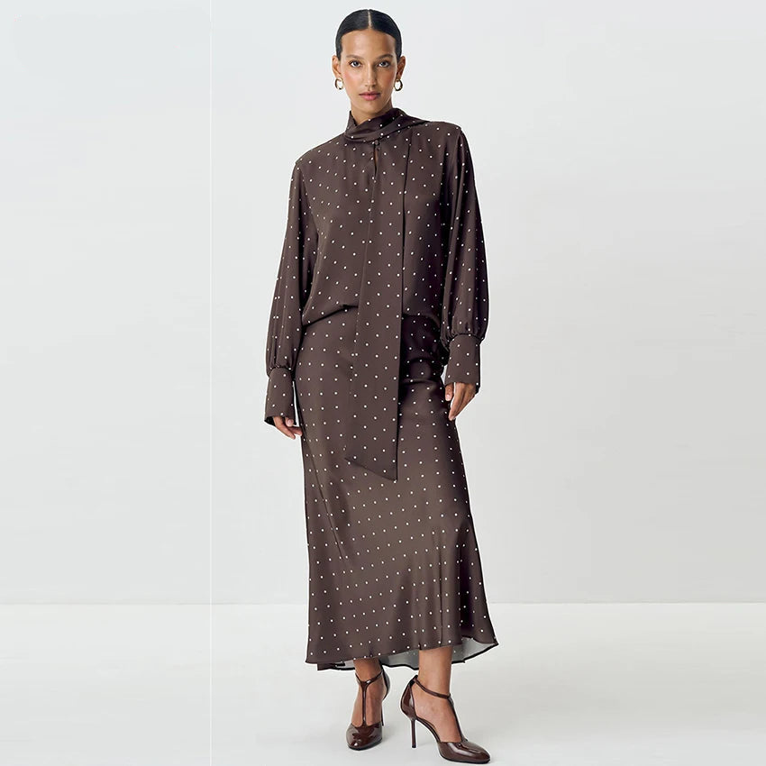 חליפה צנועה בסטייל- החליפה משלבת חצאית מקסי קלאסית מבד סאטן איכותי, בשילוב חולצה ארוכה בגזרה מעט מחוייטת ואוברסייז, עם צווארון סגור ושרוולים מתרחבים, בשילוב הדפס הנקודות שכאן כדי להשאר.