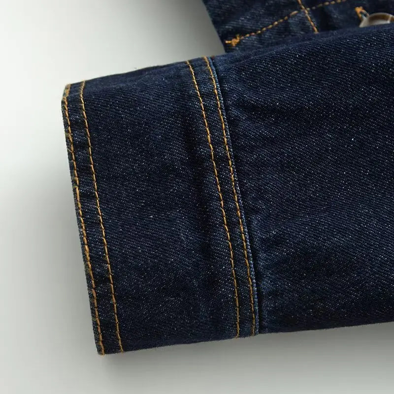 ג'קט ג'ינס במראה דנים, בגוון כחול כהה עם תיפורים בולטים ובסגירת כפתורים קדמיים.