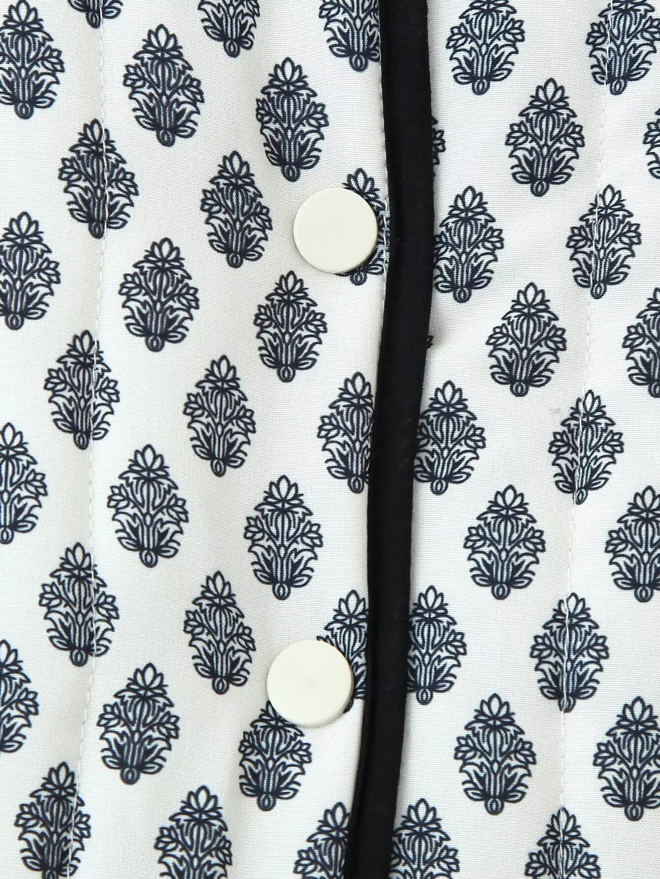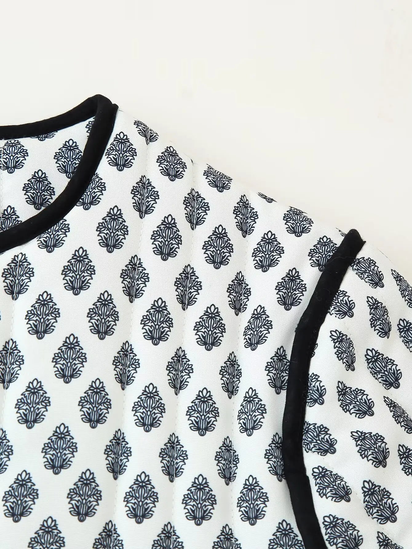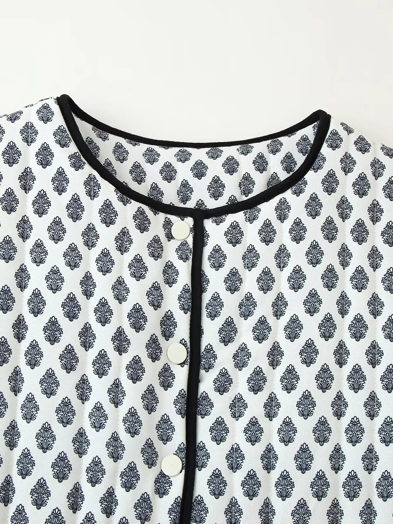 ג'קט בגזרה קצרה במראה קלאסי עם צווארון עגול בשילוב שרוולים ארוכים וכפתורים קדמיים, עם הדפס אתני.