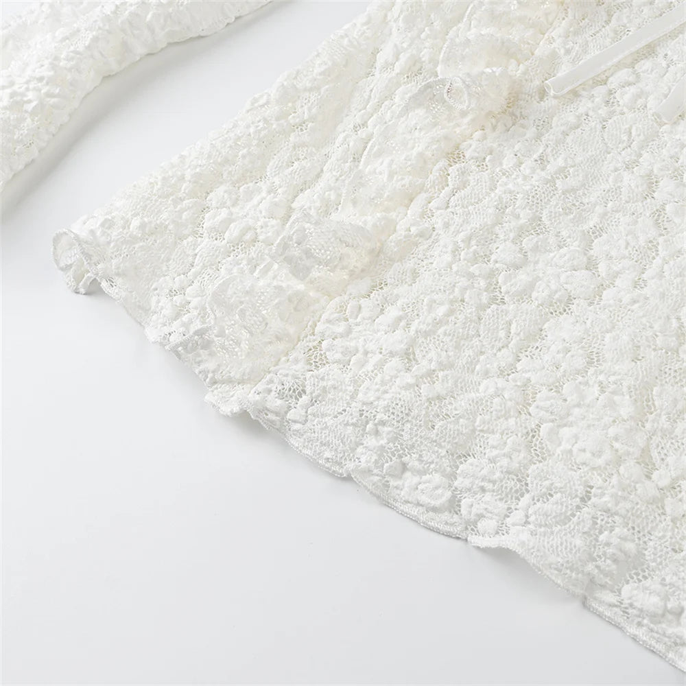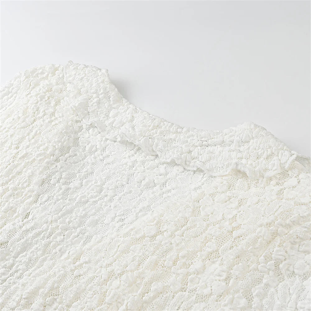 טופ תחרה צפופה עם שרוולים ארוכים בשילוב קשירה, עם צווארון וי עם קשירה ומלמלה, מעט שקפקף.