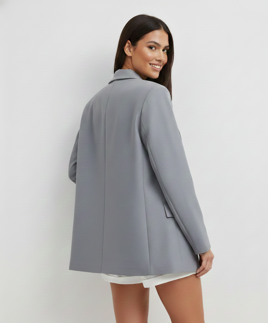 בלייזר בגזרת האוברסייז הוא פריט חובה לכל מלתחה מודרנית. הוא עוצב עם תשומת לב קפדנית לפרטים: צווארון דש רחב, כפתרה כפולה במראה נקי וכיסים מעוצבים שמוסיפים לו עומק. הבד הנשפך והגזרה המשוחררת מעניקים מראה סמכותי אך לא מתאמץ, שמתאים באופן מושלם מעל גופייה בהירה או חולצה מכופתרת. זהו פריט ורסטילי שישדרג כל הופעה – ממראה יומיומי למשרד ועד ללוק ערב מתוחכם.