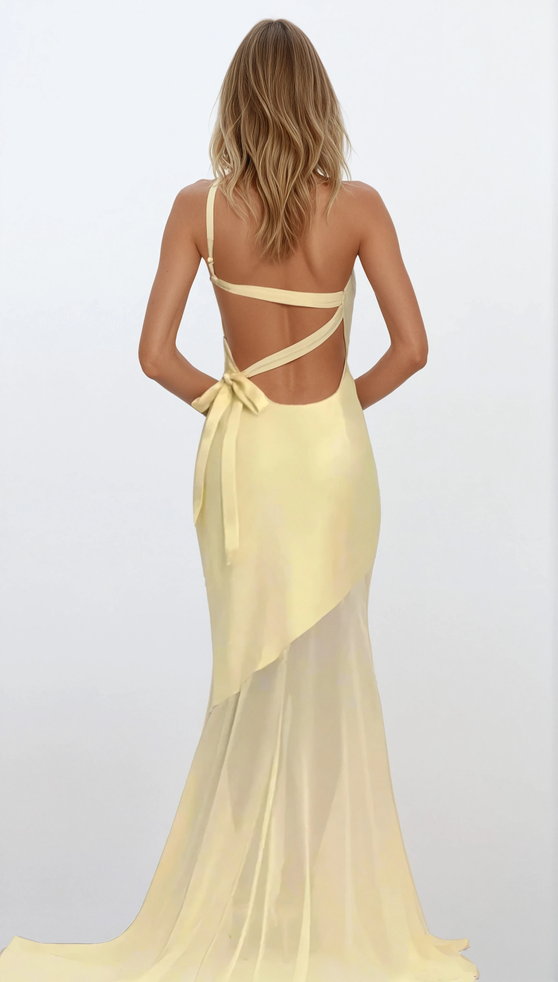 שמלת מקסי מבד סאטן רך ויוקרתי במראה נסיכותי ויוקרתי, בגזרת וואן שולדר בשילוב גב פתוח עם קשירה אחורית, בצבע חלומי של צהוב לימוני והכי מקפיץ ובשילוב שובל ארוך מאחור.