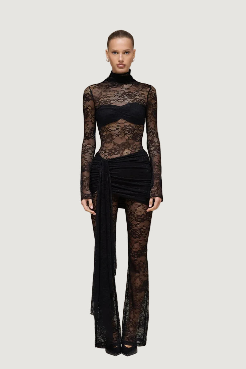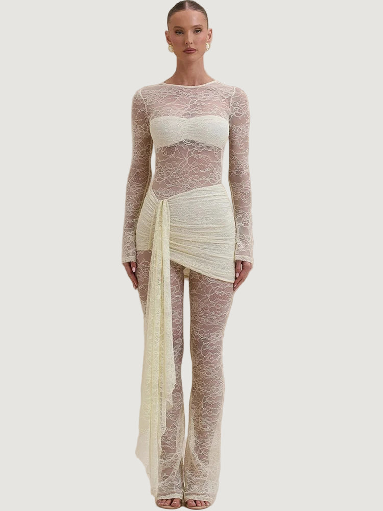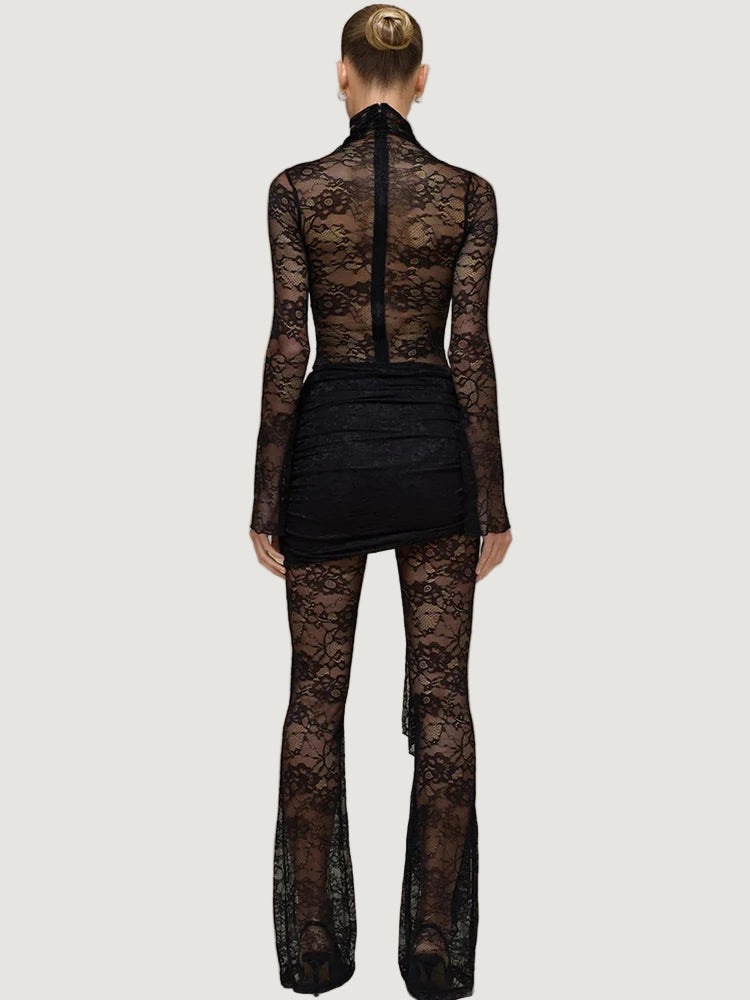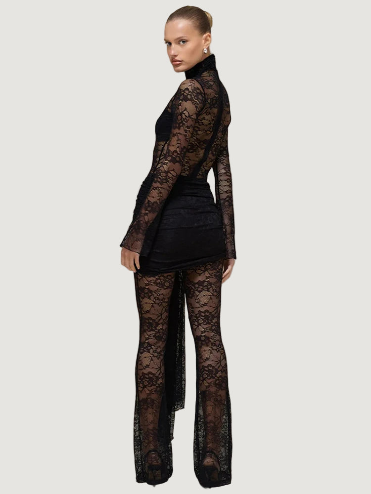 אוברול תחרה המשלב תחרה איכותית במראה צפוף ואלגנטי, עם צווארון גבוה ושרוולים ארוכים וצמודים, בשילוב כיווצים במותן ומכנס מתרחב בסיומת.