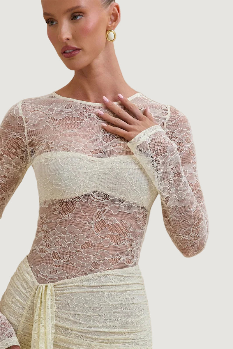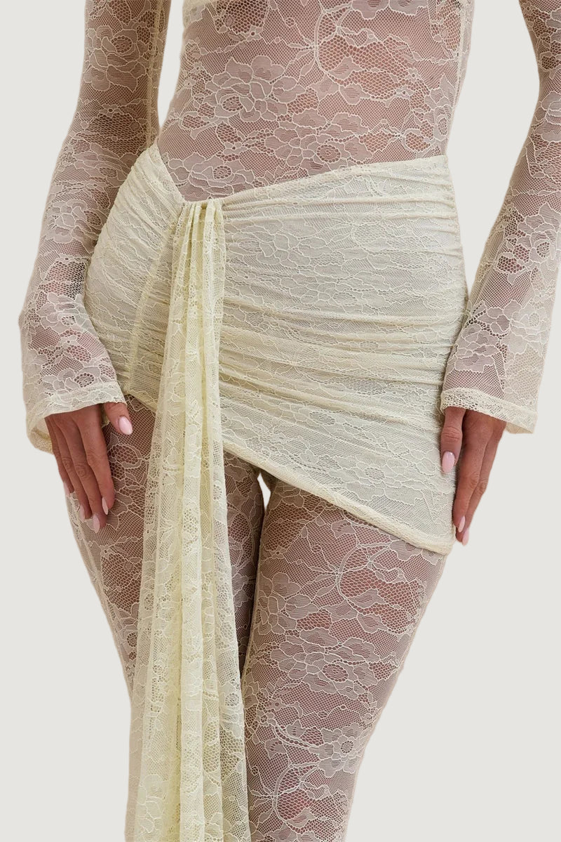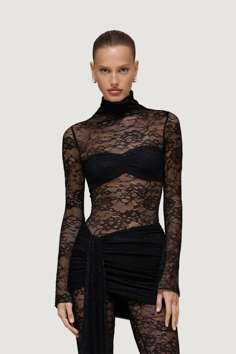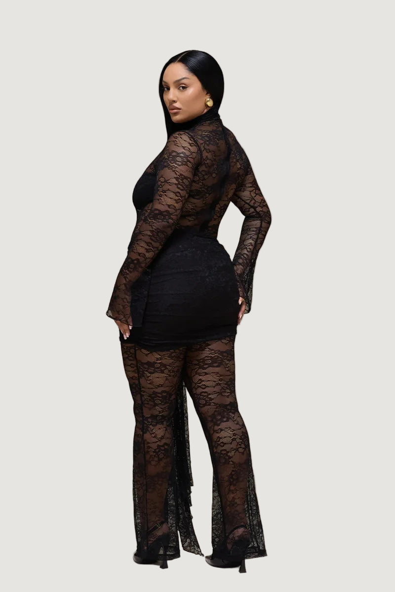 אוברול תחרה המשלב תחרה איכותית במראה צפוף ואלגנטי, עם צווארון גבוה ושרוולים ארוכים וצמודים, בשילוב כיווצים במותן ומכנס מתרחב בסיומת.