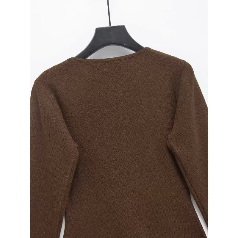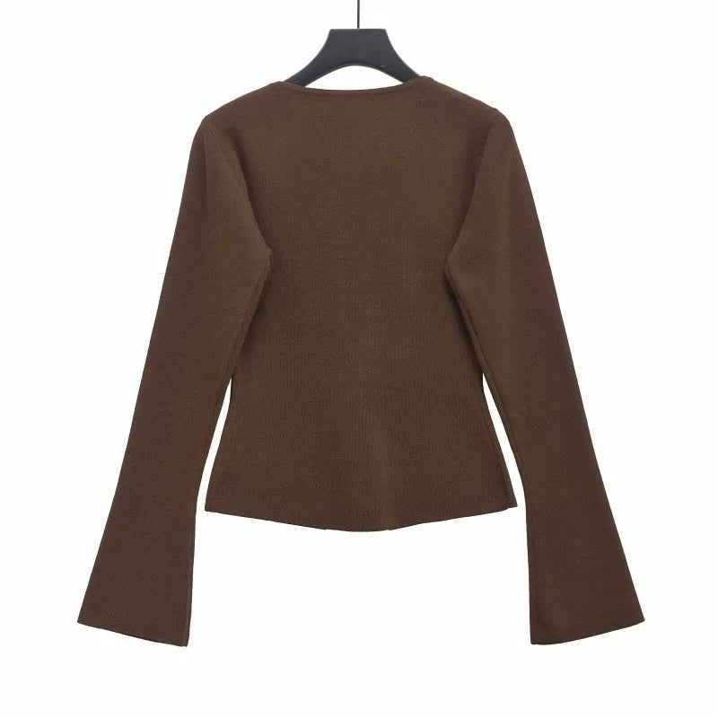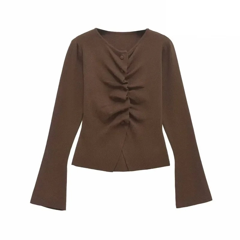 טופ קלאסי עם שרוולים ארוכים מתרחבים וצווארון עגול וקלאסי, בשילוב כיווצים קדמיים המחמיאים לקימורי הגוף.