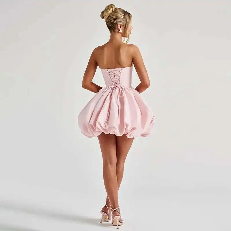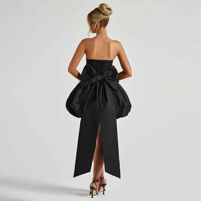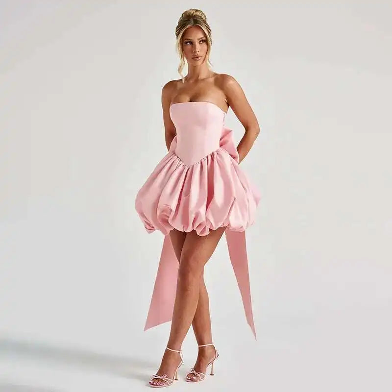 שמלת מיני בגזרת סטרפלס בשילוב מחוך וחצאית נפוחה במראה נסיכותי, בשילוב פפיון וקשירה אחורית. השמלה עשויה מבד כותנה איכותי בשילוב פוליאסטר ומשדרת לוק קלאסי יוקרתי שהולך לשבור לכולם את הלסתות.