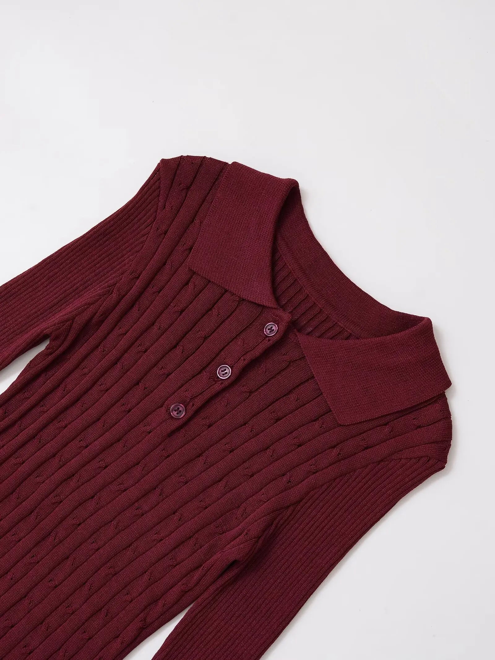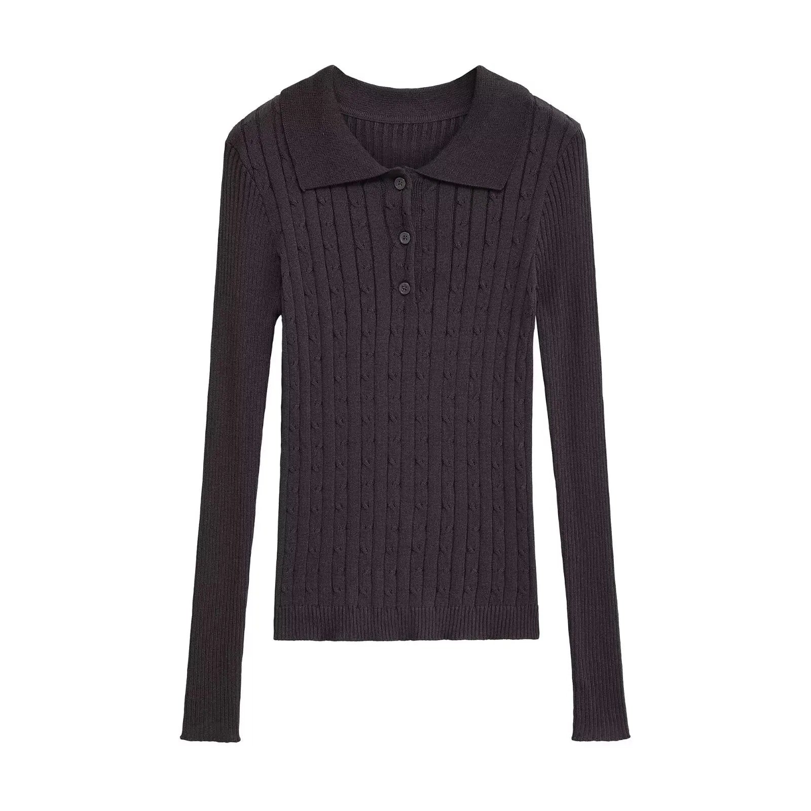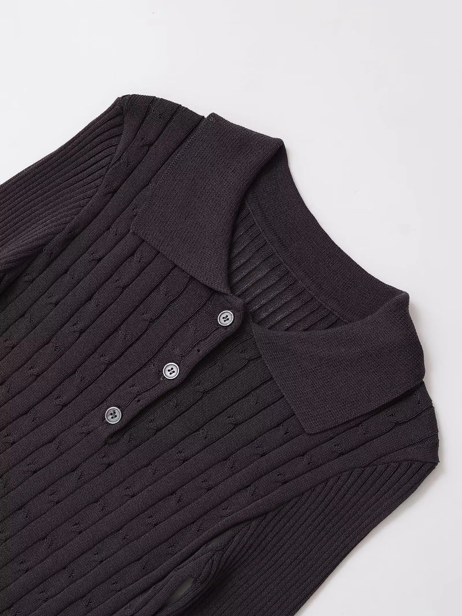 חולצת סריג בגזרה קלאסית, עשויה מבד בשילוב תערובת צמר וסיבי ספנדקס, עם צווארון פולו ובשילוב כפתורים קדמיים.