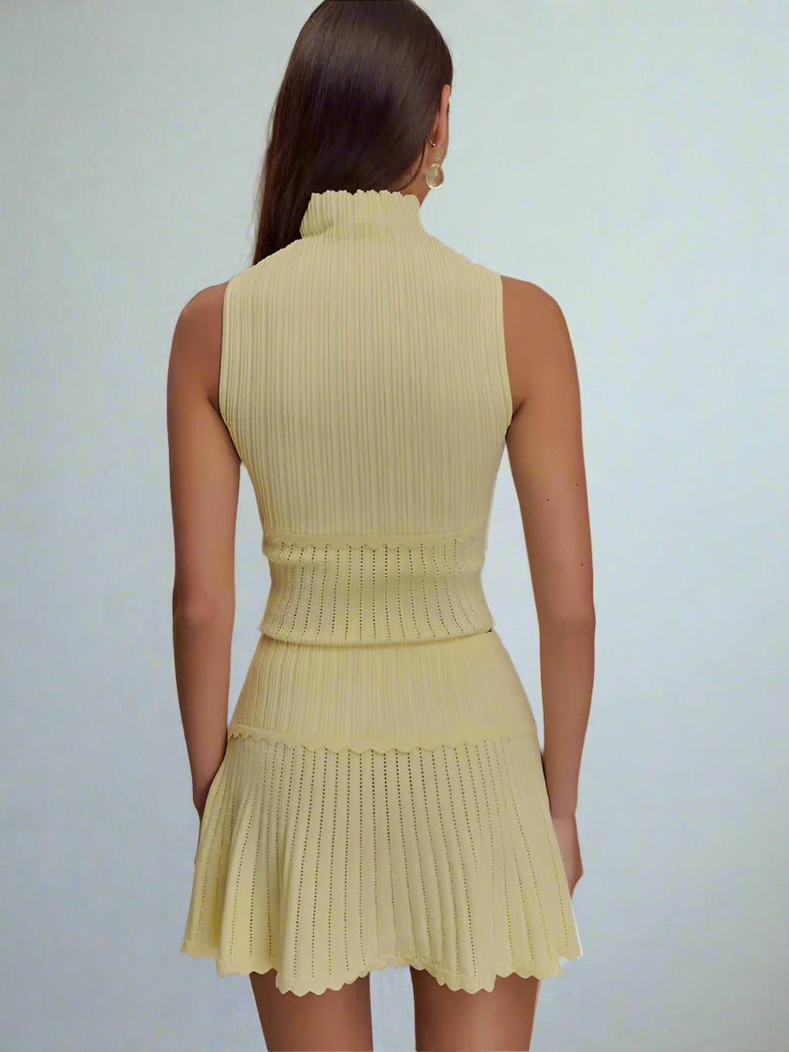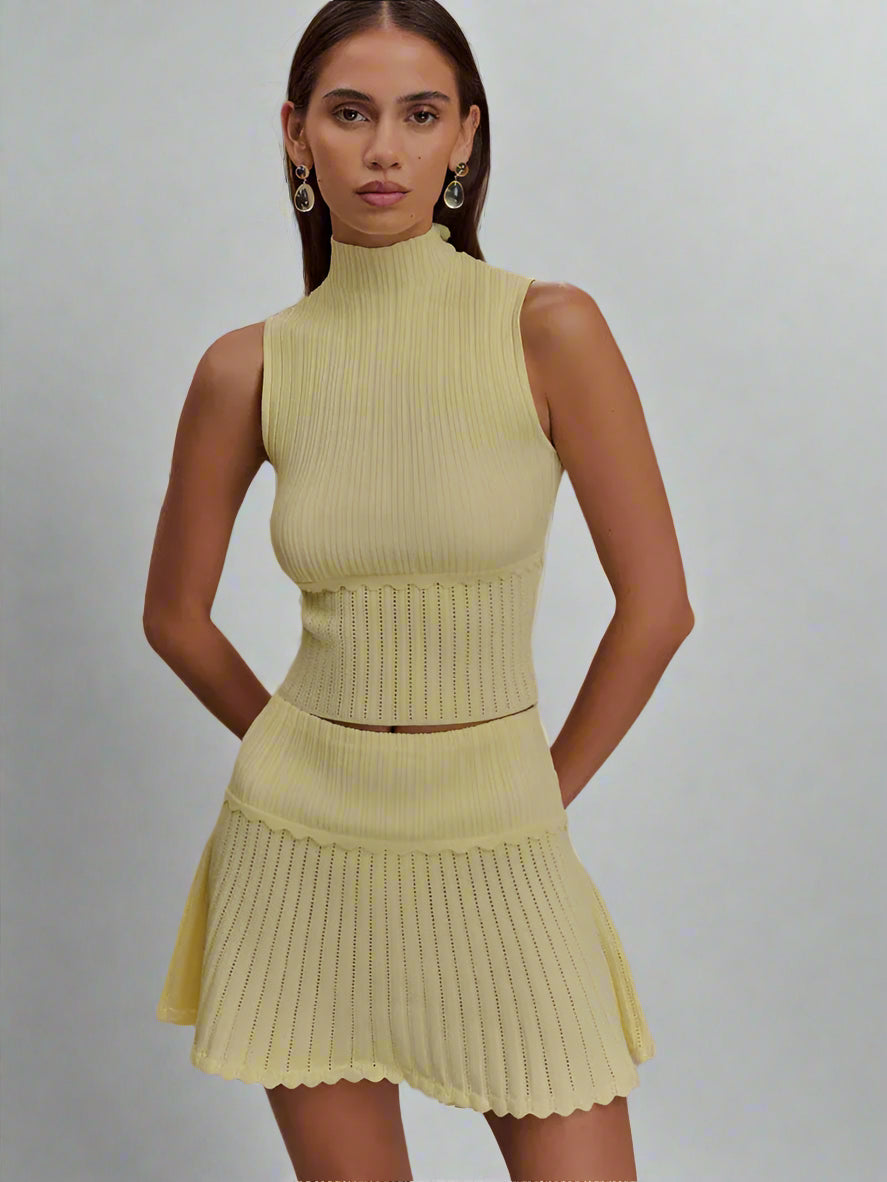 חליפת קלאסית המתאימה ליום יום או כל אירועי או חופשה קיצית, המשלבת טופ צווארון סגור קולר בשילוב חצאית מיני מבד רך ונעים בדמוי סריג. החליפה שהולכת להציל את הלוקים לחופשה שלך!