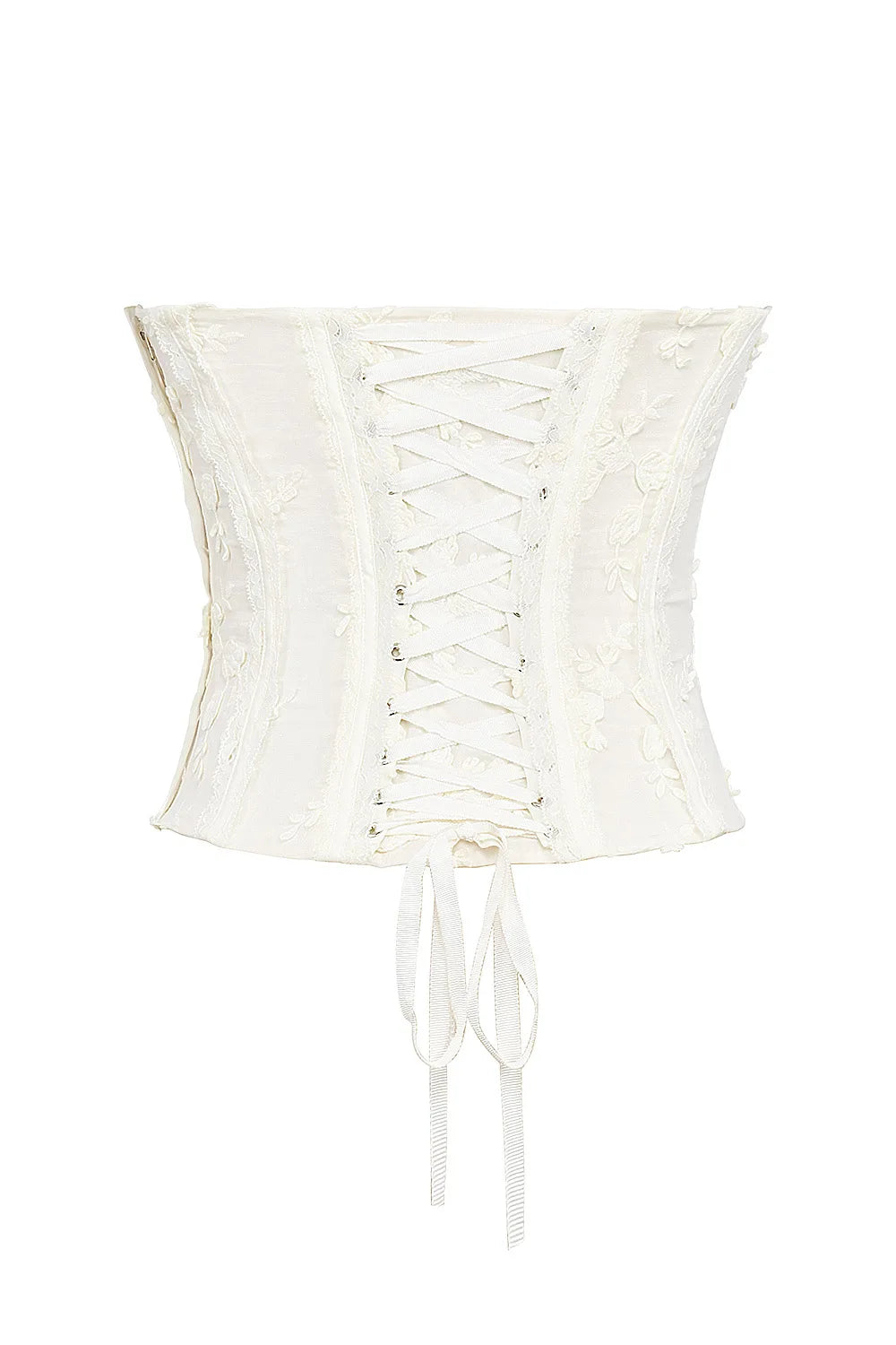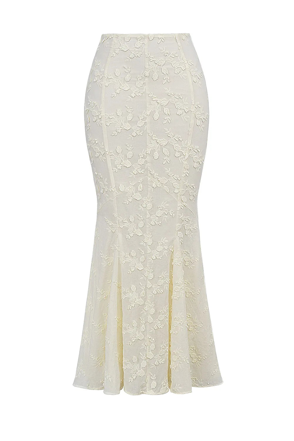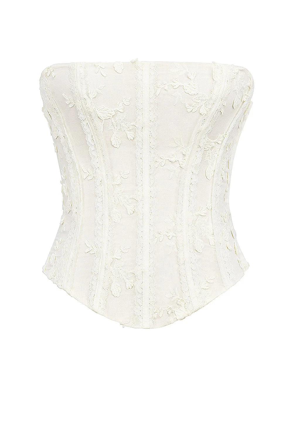 חליפת סט מבד תחרה איכותי במראה יוקרתי, עם תחרה בשילוב כותנה ותיפורים בולטים המדגישים את קימורי הגוף, מחוך סטרפלס בגזרה צמודה ומחטבת את הגוף בשילוב קשירה בגב וחצאית מקסי צמודה, חליפה עם נוכחות בלתי מתפשרת שאי אפשר להתעלם ממנה.