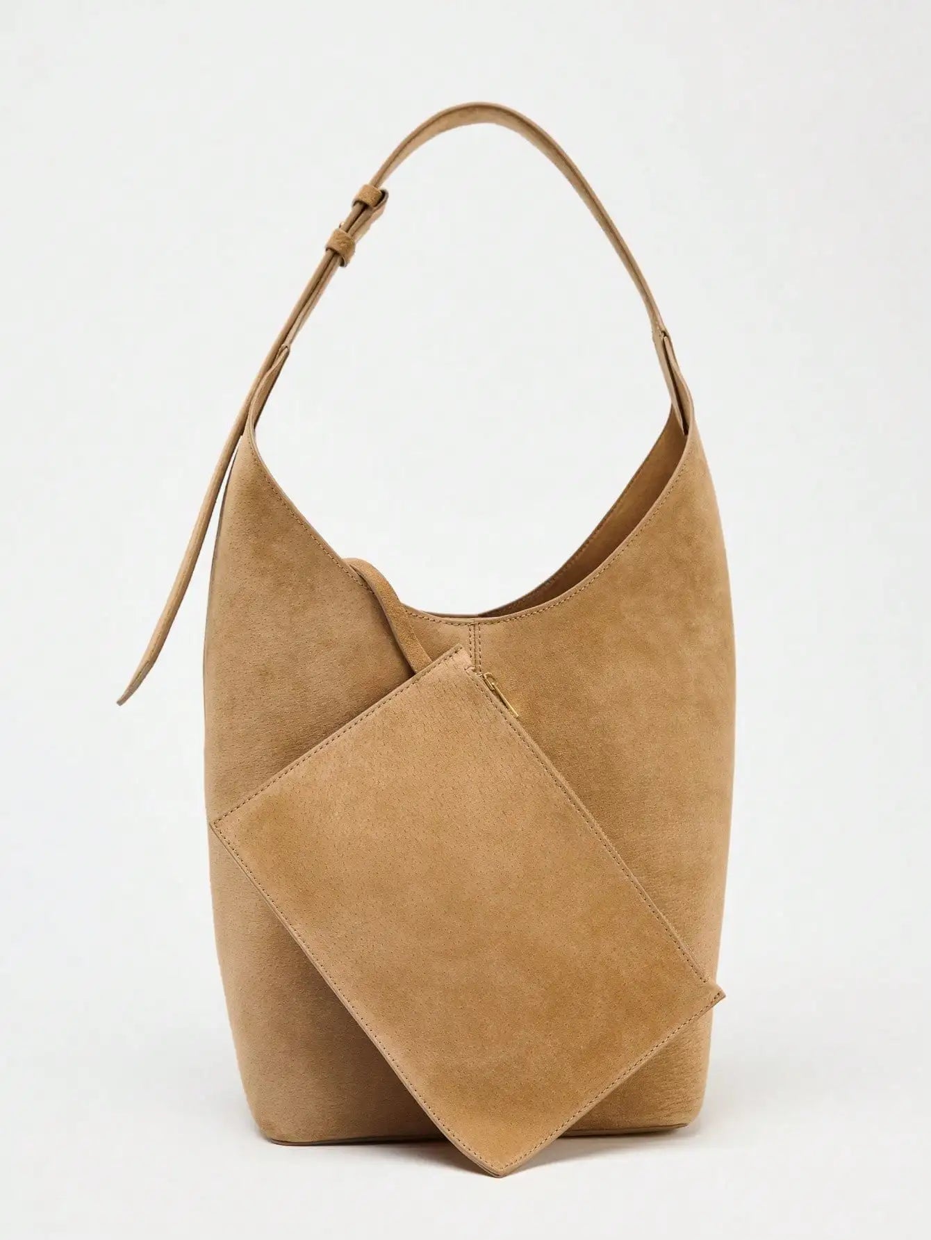 תיק יד במראה סל, עם רצועת כתף בדגם חגורה הניתנת להקטנה והגדלה, מבד זמש במראה יוקרתי.