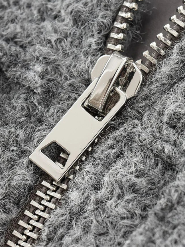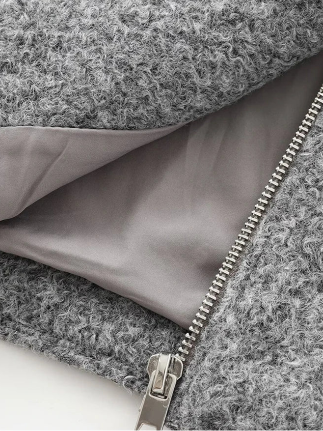 ג'קט מבד פרווה עבה ואיכותי בגזרה קצרה, עם צווארון מעט מחוייט ושני כיסים קדמיים בסגירת רוכסן כסוף.