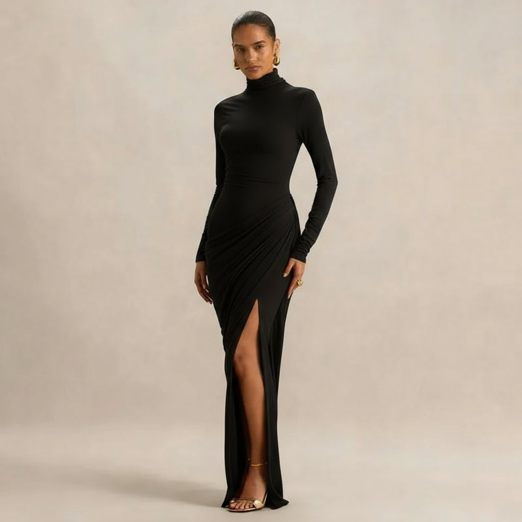 שמלת מקסי בגזרה צמודה ומחטבת, עם שרוולים ארוכים צמודים וצווארון גבוה, בשילוב חצאית ארוכה עם שסע צידי שניתן לסגור.