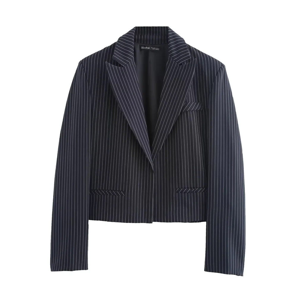 בלייזר מחוייט בגזרה קצרה עם צווארון מחוייט והדפס פסים לבנים, קלאסי ואייקוני שמתאים לכל לוק שתחשבי עליו.