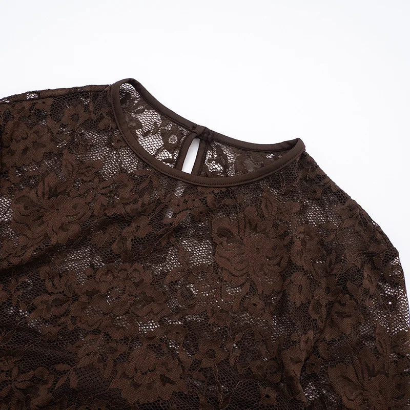 שמלת מקסי מבד צמוד המשלב תחרה שקפקפה בשילוב שרוולים ארוכים וצמודי, עם צווארון סגור וחצאית מקסי ארוכה וצמודה.