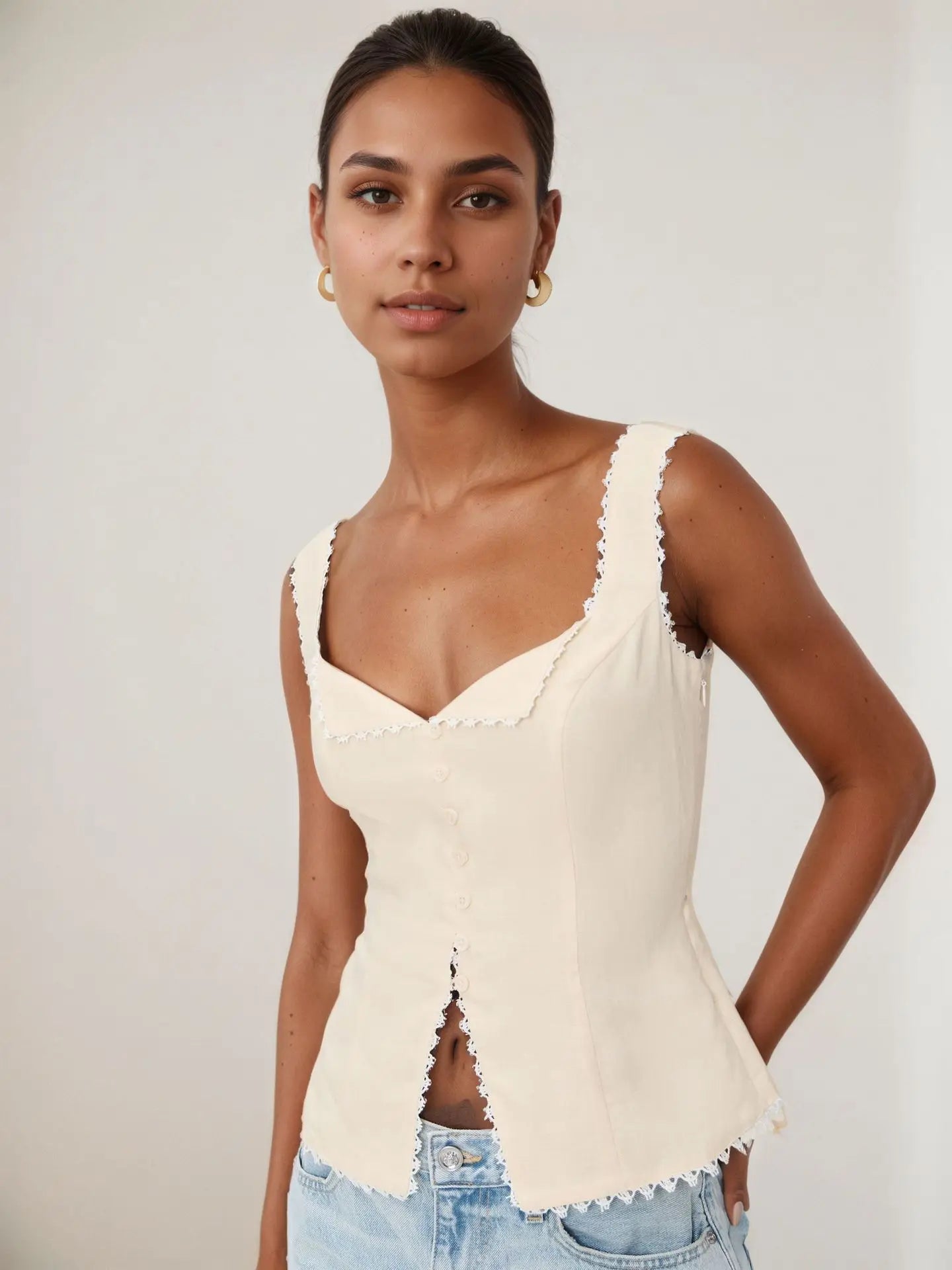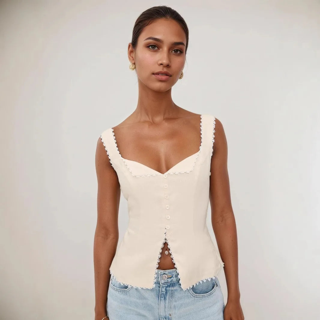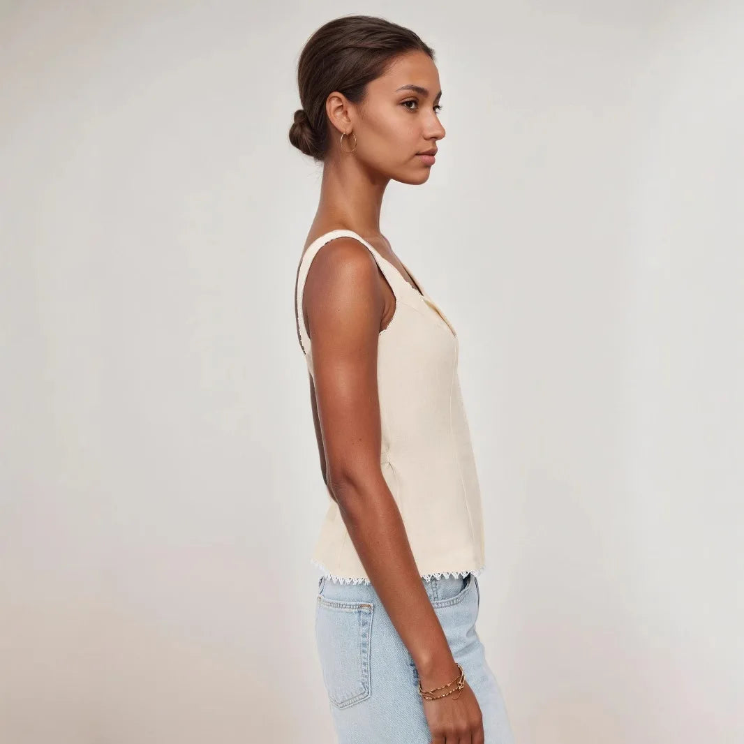 טופ לקיץ בסגנון תחרה במראה קלאסי ויוקרתי, מקפיץ כל לוק קיצי או חופשה, בשילוב תחרה ובד פשתן איכותי.