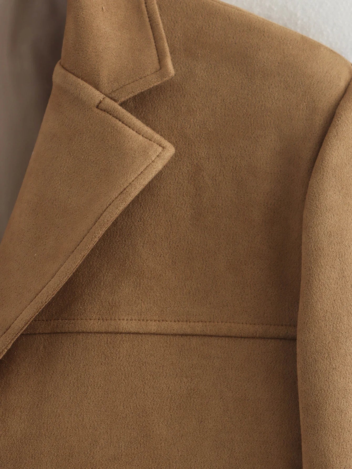 בלייזר מקולקציית דאדי במראה אוברסייז מחוייט, עם צווארון מחוייט וסגירת כפתורים קדמית.